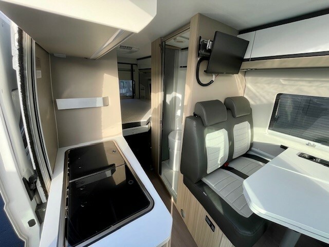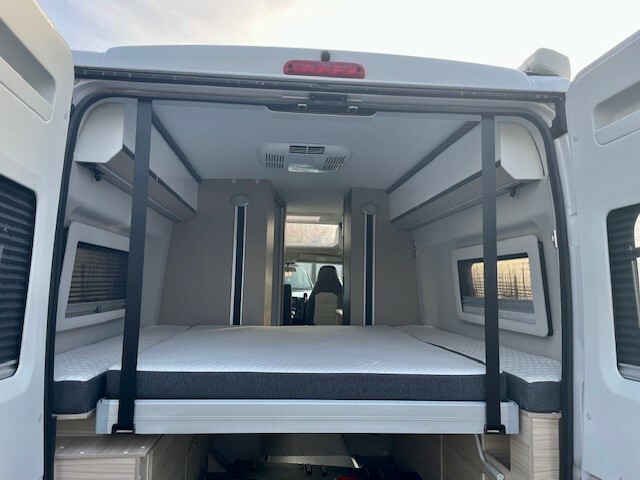 Modèle recherché avec lit arrière électrique réglable en hauteur, permettant de moduler la soute pour transporter vélos ou moto tout en conservant le couchage.