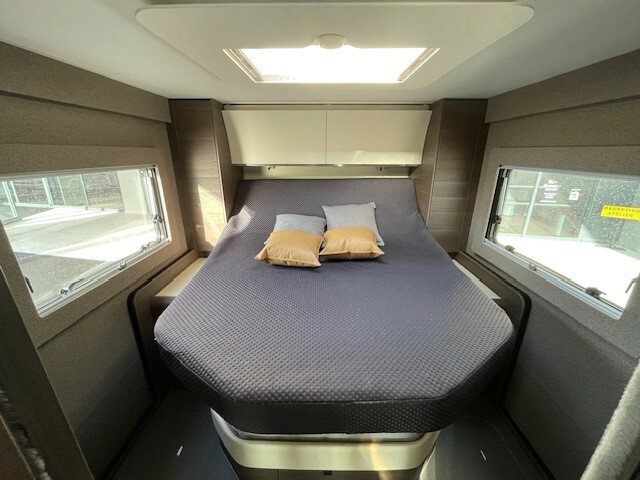 Arrière : Lit central (195x150) relevable électriquement avec tête de lit coulissante.