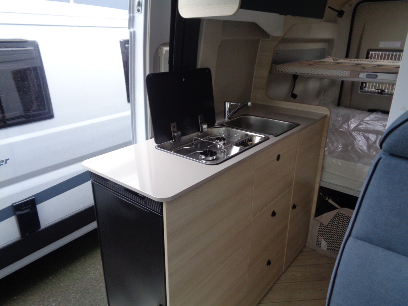 - Pack Accessoires Van : Store extérieur, panneau solaire 200W, éclairage extérieur de porte cellule, moustiquaire de porte, store intérieur cabine, compléments de couchage dinette, enjoliveurs de baies arrières