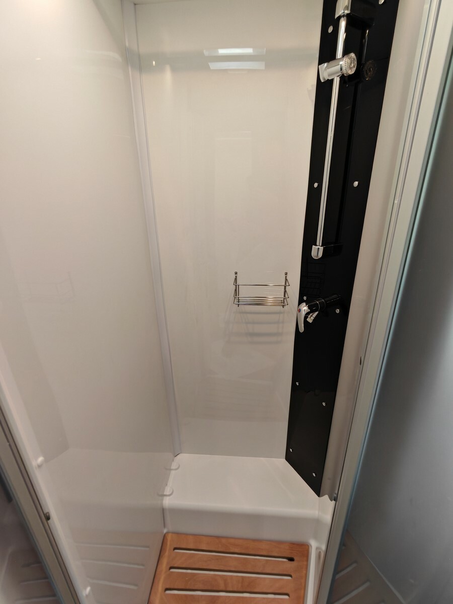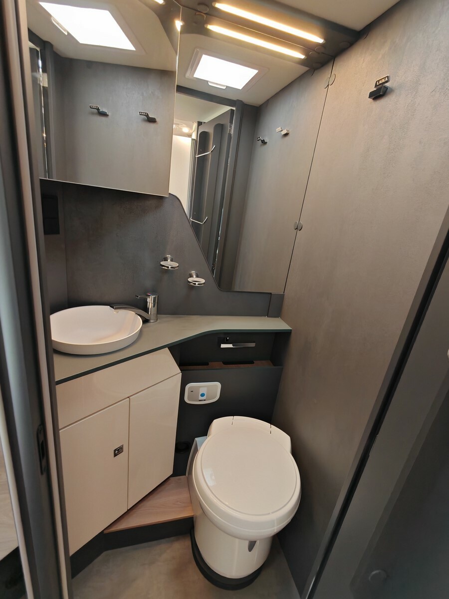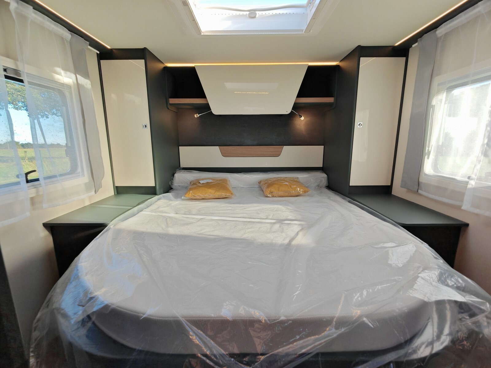 - Pack Confort (caillebotis de douche en bois, tapis de cabine, réservoir d'eaux usées isolé et chauffé, hotte aspirante, lanterneau Skyview dans la cabine, habillage parois arrière de la chambre en simili-cuir, grand tiroir et porte-bouteille coulissants dans la cuisine, porte cellule vitrée Premium XL avec fermeture centralisée et vérins à gaz, Prédisposition caméra de recul, sièges cabine assortis au salon),