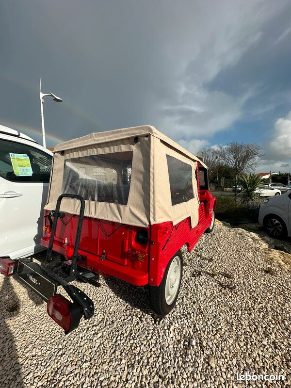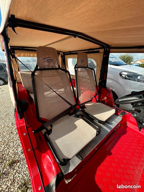 Mehari E-Story Electrique Pack Pure Motorisation 15KW soit 20cv Homologation Quadricycle Lourd Boite automatique Voiture mythique avec différent coloris : Vert / Rouge / Jaune et Bleu Longueur : 3.60m Largeur : 1.50m Hauteur : 1.63m 4 places carte grise Options : Pack Pure Peinture carrosserie Coloris sellerie Jantes qualité supérieure Modes de conduites différencié Volant bois Fermeture de bâche complète Suspensions et amortisseurs comme d'origine Toile de toit PVC Projecteurs avant full LED Prise allume USB et allume cigare Chargeur 20A utilisable sur prise domestique Batterie lithium fer phosphate 100% recyclable Jusqu'à 148 KM d'autonomie selon la norme WMTC ( 110km pour 10Kwh de batterie ) Peut se conduire dès l'âge de 16 ans Porte vélo Garantie 2 ans pièces et main d'oeuvre La livraison se fera dans nos locaux accompagnée d'une personne expérimentée, nous vous apporterons tous les conseils nécessaires à l'usage et l'entretien de " VOTRE CAMPING CAR qui est NOTRE PASSION " BIENVENUE à OLERON ! Reprise possible de votre camping-car, de votre voiture, de votre utilitaire, ou de votre caravane. " autres modèles NEUFS et d'OCCASION visibles sur place ou sur commande " OLERON CARAVANES CAMPING CARS route des chateliers 17310 st pierre d'oleron ouvert du Lundi au samedi de 9h00 12h30 / 14h00 18h30